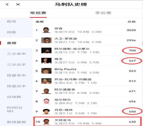 凭借新赛季前2战的12记盖帽,文班亚马NBA生涯的总盖帽数达到了430个,成功跻身马刺队史盖帽榜前十,距离第9丹尼-格林的450个只差20个。