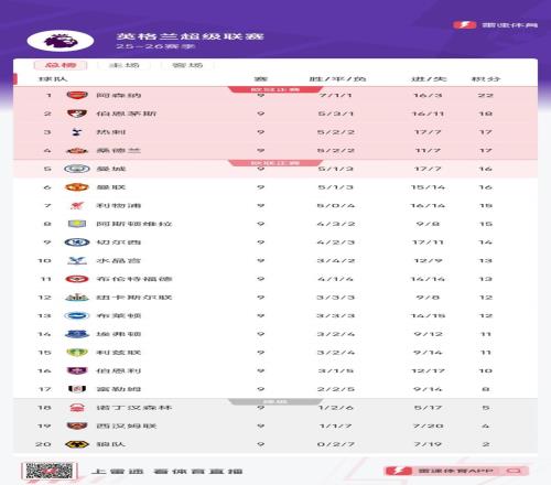 雷速体育10月27日宣 英超第九轮比赛已经全部结束,积分榜方面,阿森纳22分继续领跑,伯恩茅斯第二,热刺、桑德兰分列三四位。