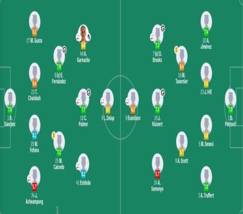 切尔西首发:1-桑切斯、34-乔什·阿昌庞(46'24-詹姆斯)、23-查洛巴、27-古斯托、29-福法纳、25-凯塞多、8-恩佐、41-埃斯特旺(92'11-吉滕斯)、10-帕尔默(63'20-若昂·佩德罗)、49-加纳乔(46'7-内托)、9-德拉普(87'17-桑托斯)