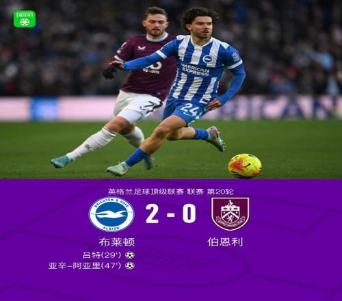 北京时间1月3日,英超联赛第20轮展开较量,布莱顿坐镇主场迎战伯恩利。上半场,科斯图拉斯送出精准助攻,吕特抓住机会率先打破僵局。下半场,亚辛-阿亚里再下一城,卡迪奥卢上演门线解围。最终,布莱顿主场2-0战胜伯恩利。