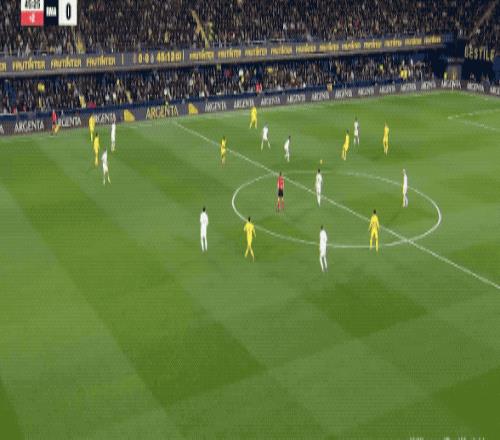 第62分钟,比利亚雷亚尔的任意球设计巧妙,莫雷诺身边无人,居然将球打高,黄潜自家球迷都摊手表达不满。